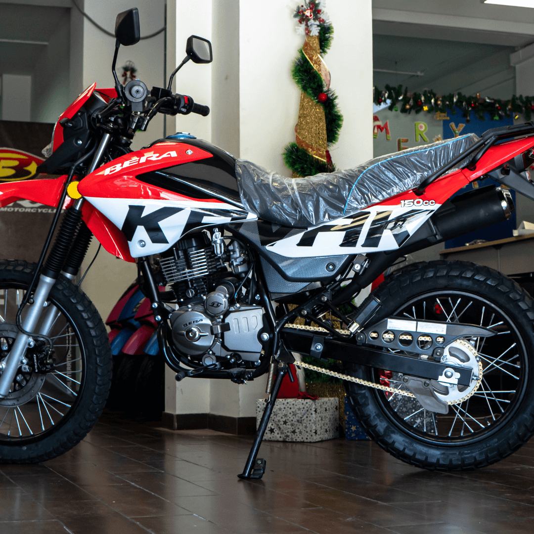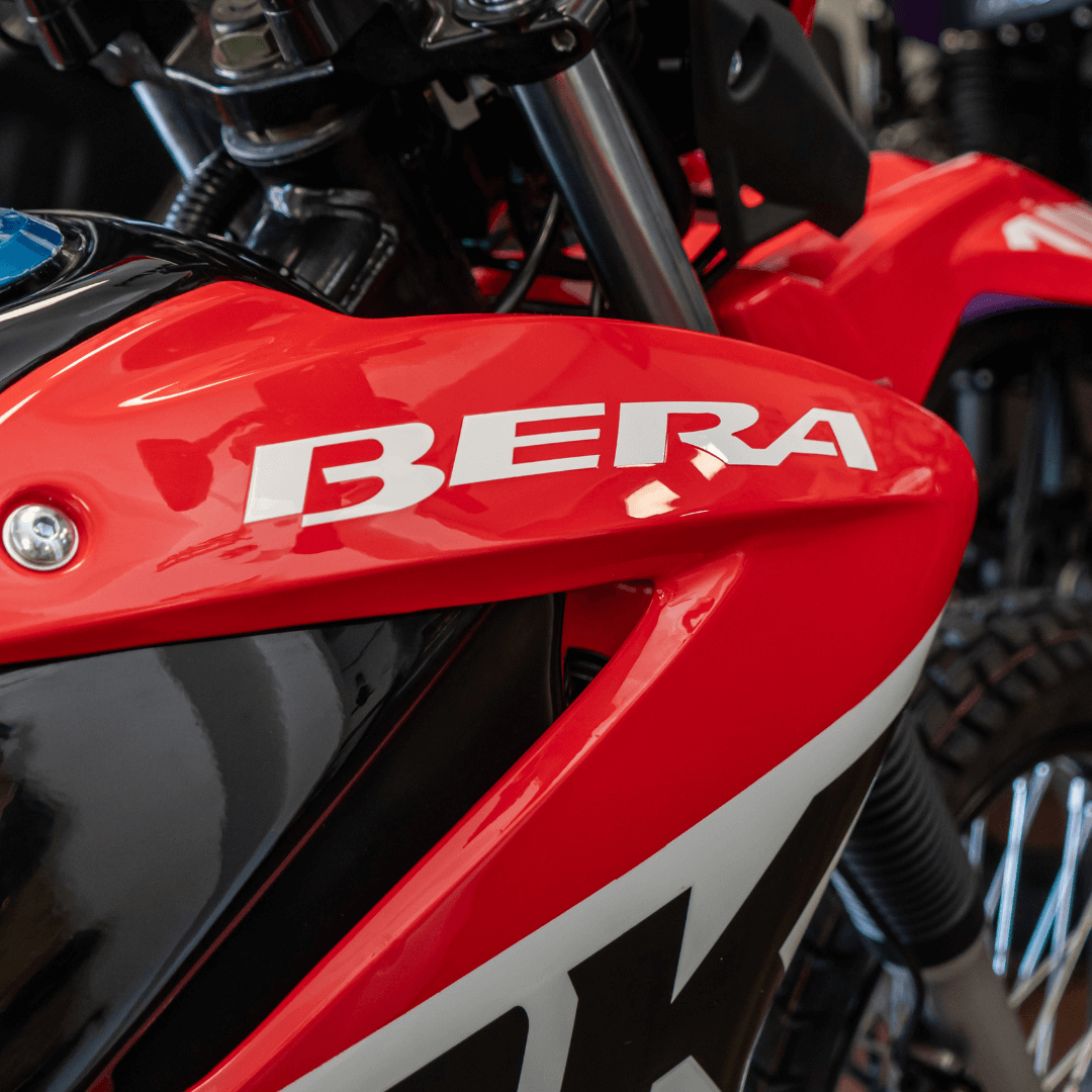 Las motos Bera están equipadas con sistemas de frenos confiables (disco delantero + tambor trasero), suspensiones reforzadas y un diseño que prioriza la estabilidad en todo terreno. Además, cumplen con los estándares de seguridad exigidos.